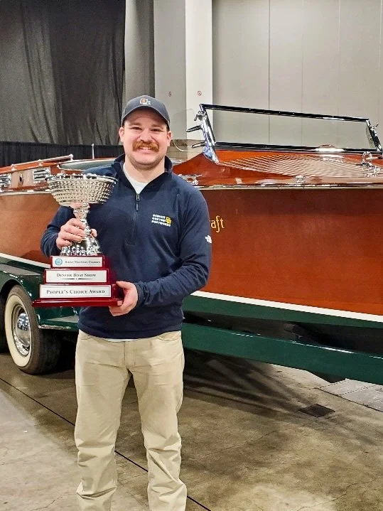 In addition to my own booth for Denver Custom Boatworks, I brought along Just Lovely, the 1929 Chris-Craft triple cockpit. She’s owned by the Rocky Mountain Wooden Boat School, of which I serve as president of the board, and we entered her in the people’s choice competition sponsored by Rocky Mountain Classics. After over 1,000 visitors to the boat and over 500 ballots cast, Just Lovely won the People’s Choice Award!